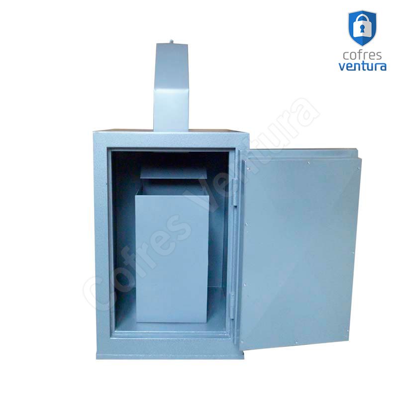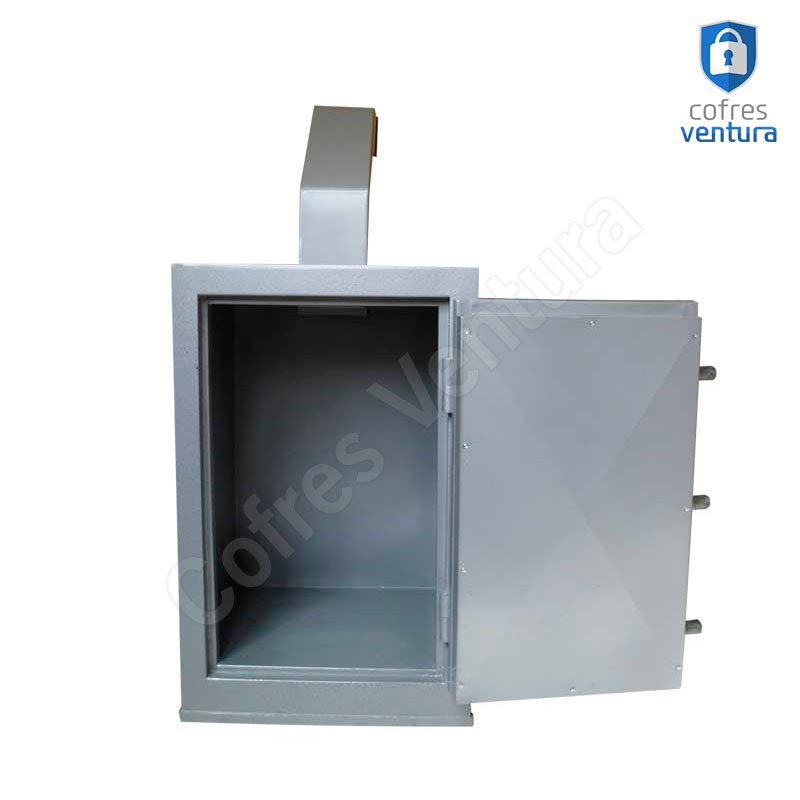 ESTRUTURA DO COFRE | Revestido internamente com concreto de alta densidade Possui um sistema anti-arrombamento que garante a segurança do conteúdo do cofre mesmo que as dobradiças (gonzos) sejam danificadas; Trava com 03 ferrolhos de aço de 23 mm de diâmetro; |