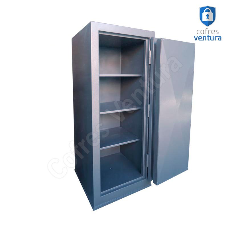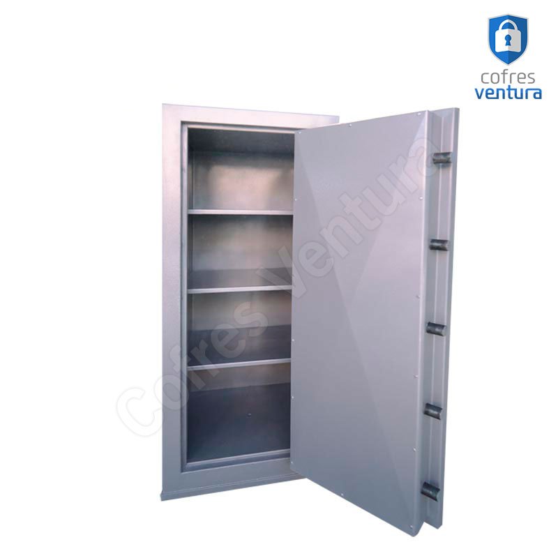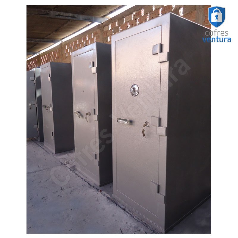 ESTRUTURA DO COFRE | Gabinete fabricado em chapa de aço de alta espessura e a porta em chapa de aço de 3,0 mm; Revestido internamente com concreto de alta densidade Possui um sistema anti-arrombamento que garante a segurança do conteúdo do cofre mesmo que as dobradiças (gonzos) sejam danificadas; Trava com 05 ferrolhos de aço de 32 mm de diâmetro; |
