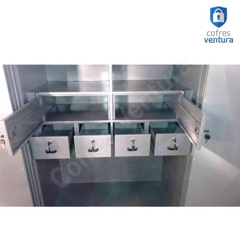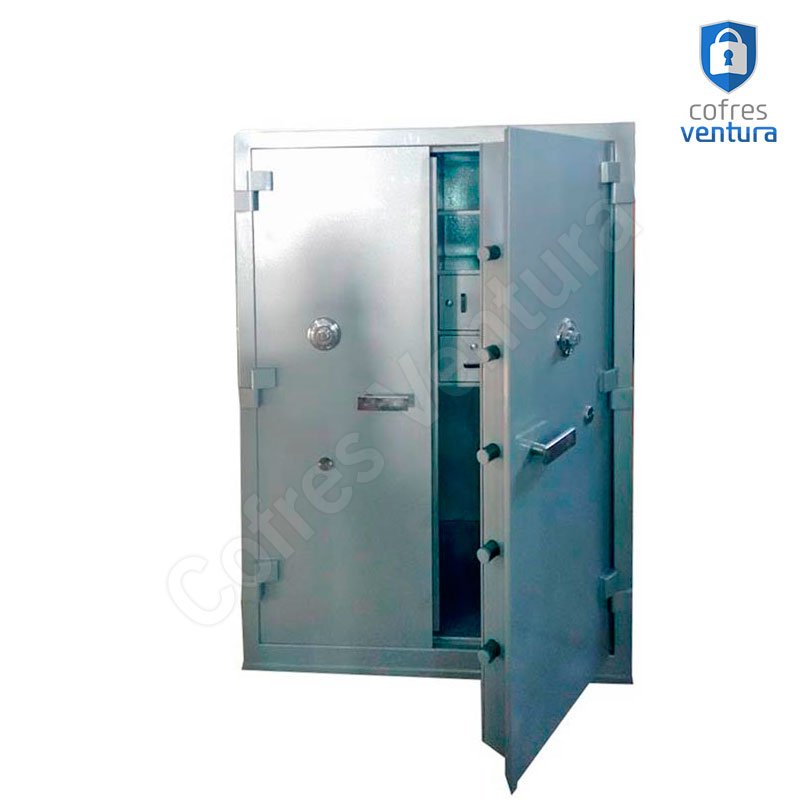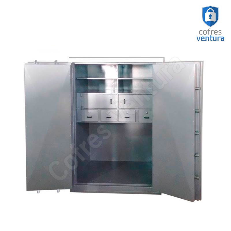 ESTRUTURA DO COFRE | Gabinete fabricado em chapa de aço de alta espessura e a porta em chapa de aço de 3,0 mm; Revestido internamente com concreto de alta densidade Possui um sistema anti-arrombamento que garante a segurança do conteúdo do cofre mesmo que as dobradiças (gonzos) sejam danificadas; Trava com 09 ferrolhos de aço de 32 mm de diâmetro; |