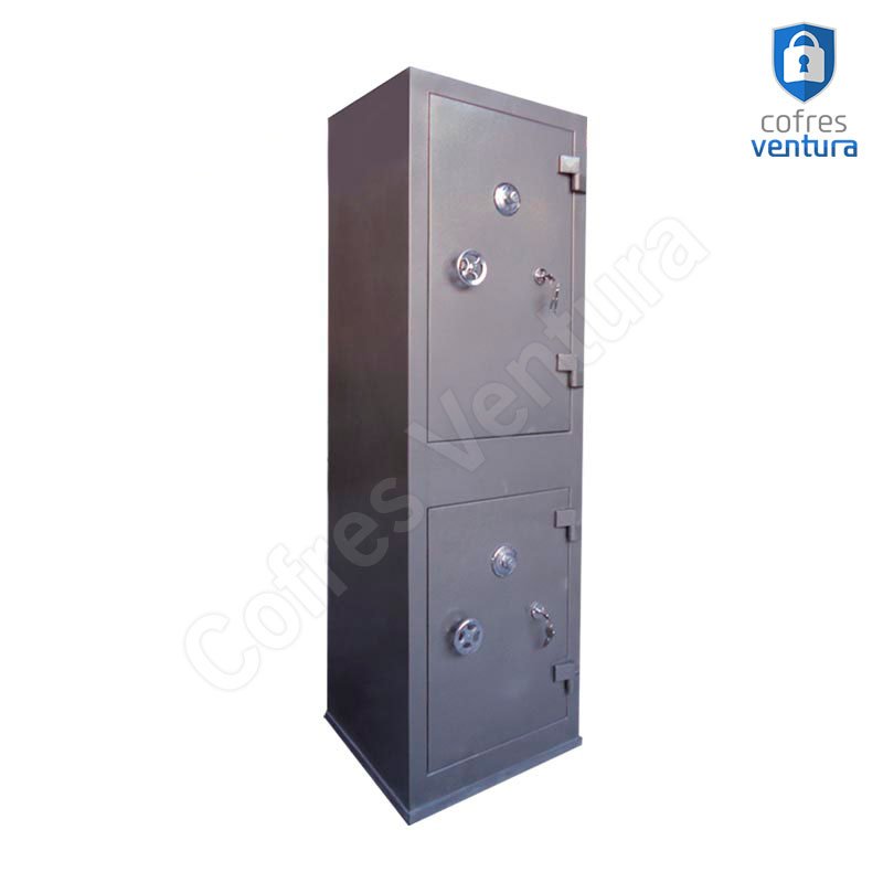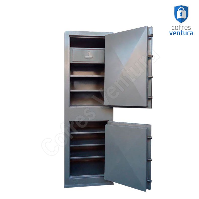 ESTRUTURA DO COFRE | Gabinete fabricado em chapa de aço de alta espessura e a porta em chapa de aço de 3,0 mm; Revestido internamente com concreto de alta densidade Possui um sistema anti-arrombamento que garante a segurança do conteúdo do cofre mesmo que as dobradiças (gonzos) sejam danificadas; Trava com 07 ferrolhos de aço de 32 mm de diâmetro; |