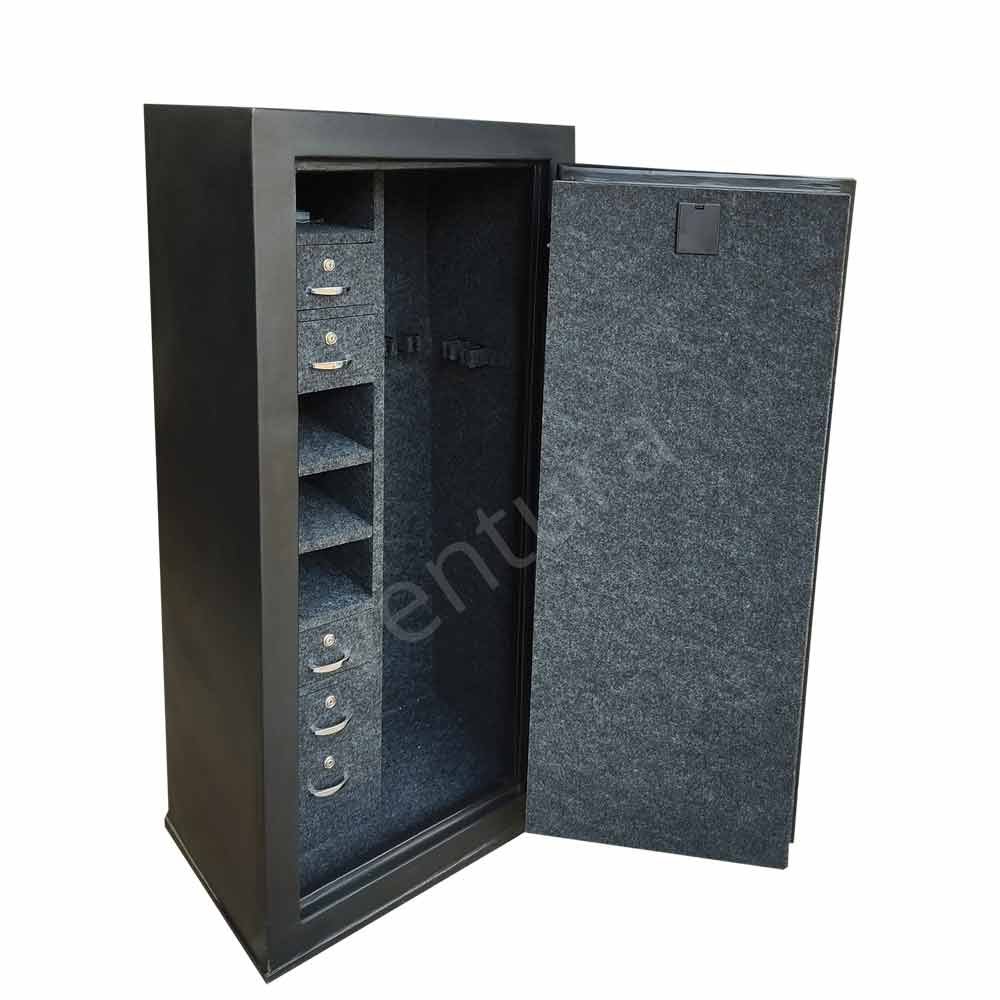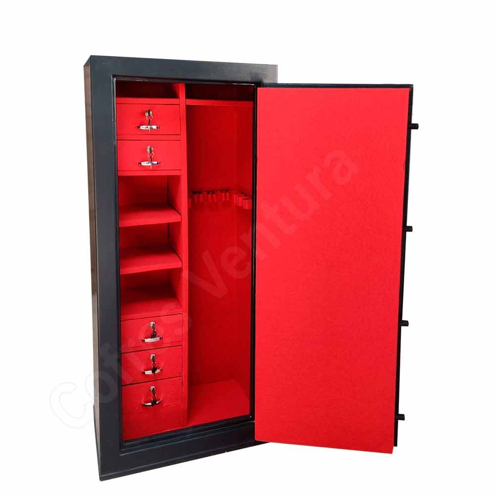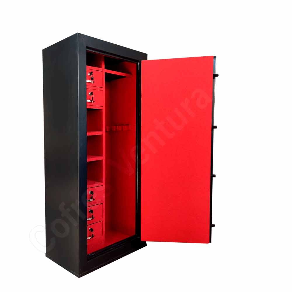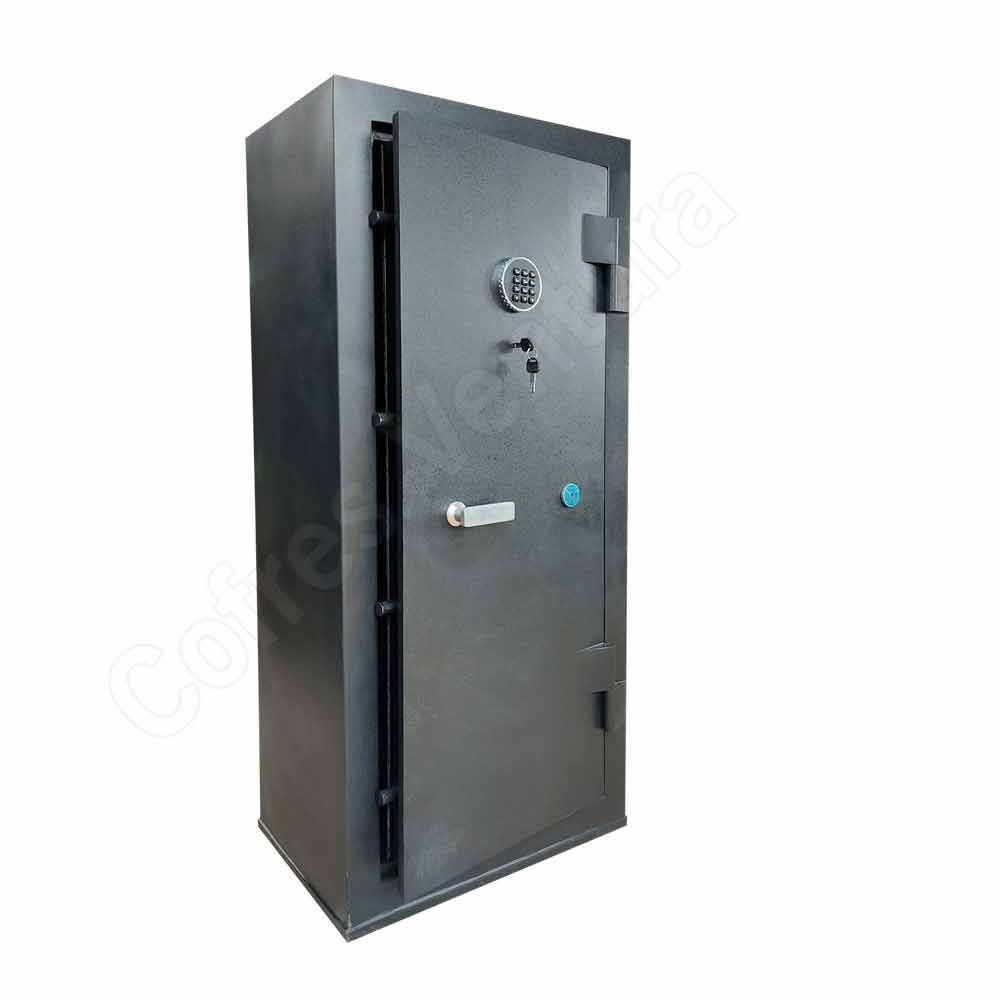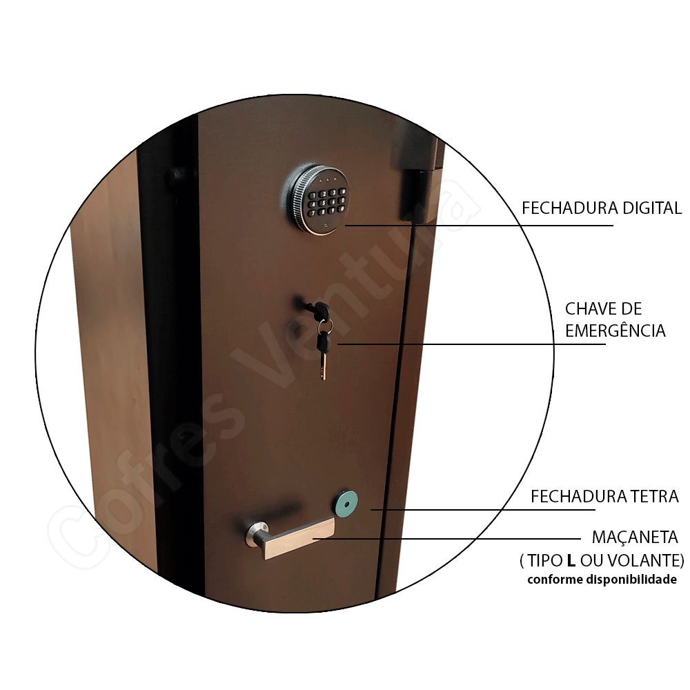 Estrutura do cofre: Corpo fabricado em chapa de 1,2mm e porta em chapa 2mm. Porta com 04 travas maciças de 18mm de diâmetro. Pintura em esmalte sintético. Gavetas com fechaduras. O cofre já vai com 04 furos na parte de trás para fixação na parede.