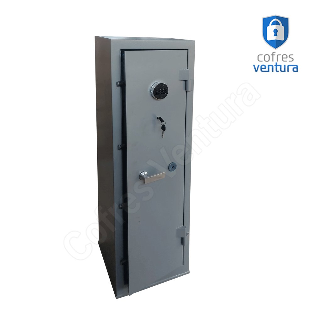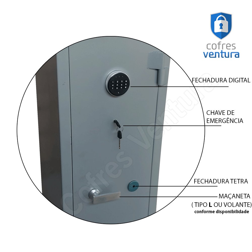 ESTRUTURA DO COFRE | Gabinete fabricado em chapa de aço de 1,2mm de espessura e a porta em chapa de aço de 3 mm; Trava com 04 ferrolhos de aço de 18 mm de diâmetro; |