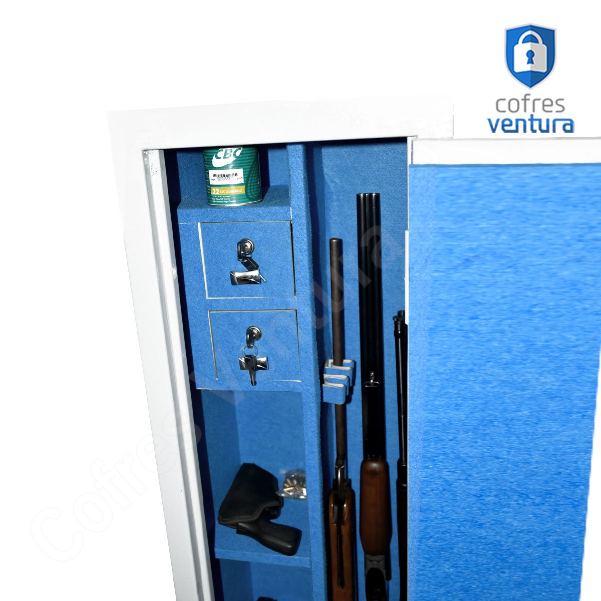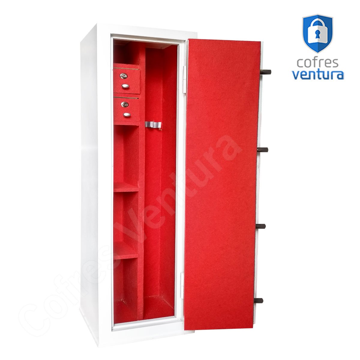 ITENS INCLUSOS | 01 cofre em aço 130 cm 03 Chaves 02 Gavetas 02 Prateleiras Suportes para armas longas Manual do Produto + 04 furos para fixação na parte de trás |