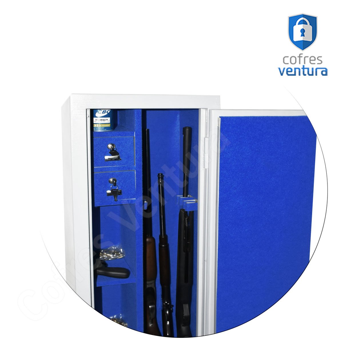 ITENS INCLUSOS | 01 cofre em aço 140 cm 03 Chaves 02 Gavetas 03 Prateleiras Suportes para armas longas Manual do Produto + 04 furos na parte de trás para fixação |