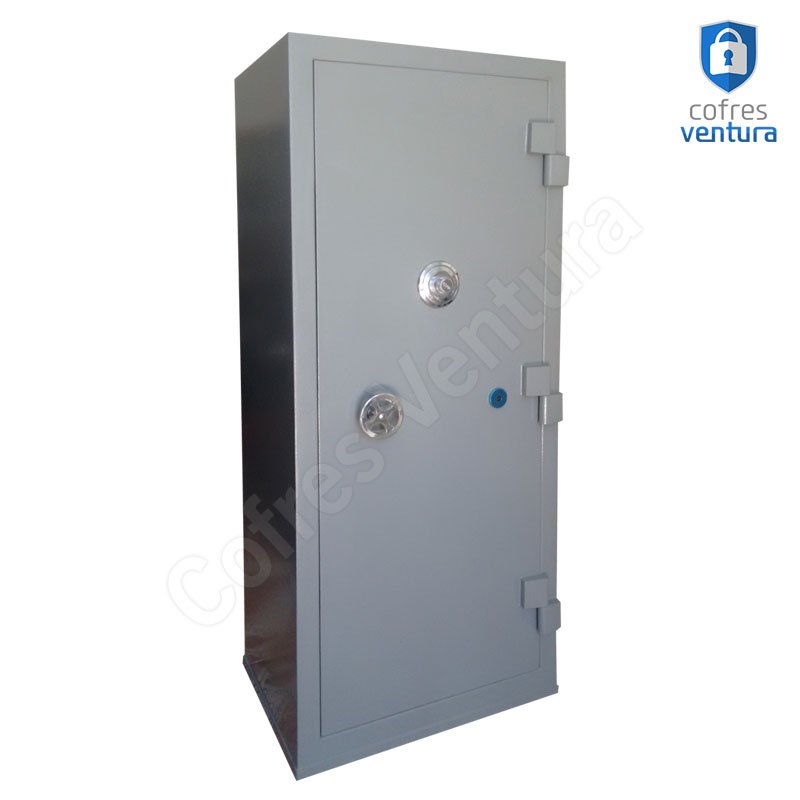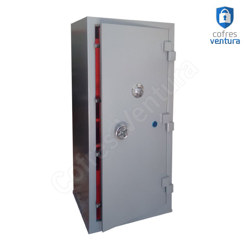 ESTRUTURA DO COFRE | Gabinete fabricado em chapa de aço de alta espessura e a porta em chapa de aço de 3 mm; Trava com 04 ferrolhos de aço de 23mm de diâmetro; |